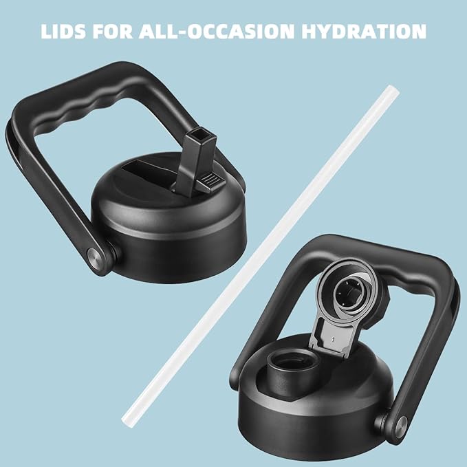 - WATER BOTTLE WITH STRAW AND HANDLE: Our 64 oz water bottle features 1 SPILL-PROOF STRAW LID and 1 EASY-POUR SPOUT LID. Complete with the easy-to-carry, big handle, you can enjoy one-handed drinking while you're on the go