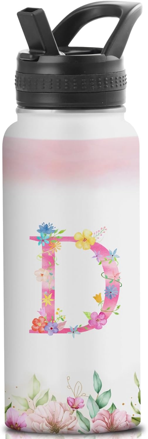 Personalized 32oz Water Bottle with Straw Customized Initial Letter Sport Bottles Monogrammed Initial Insulated Bottle Coffee Mug for Travel (D)
