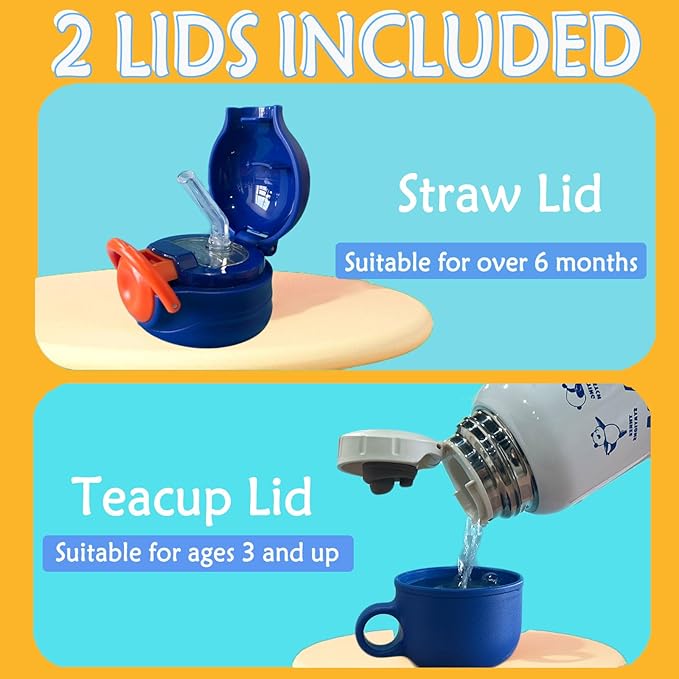 - 【HUMANIZED DESIGN】Portable Leakproof 15oz Water Jug has a built-in silicone seal on every cap, which prevents the liquid from splashing leakage and dust. Thermos bottle one of lids feature a portable straw design, allowing for easy opening with a simple one-touch button and a secure safety lock for closure.Also wide mouth opening is ice-cube friendly.