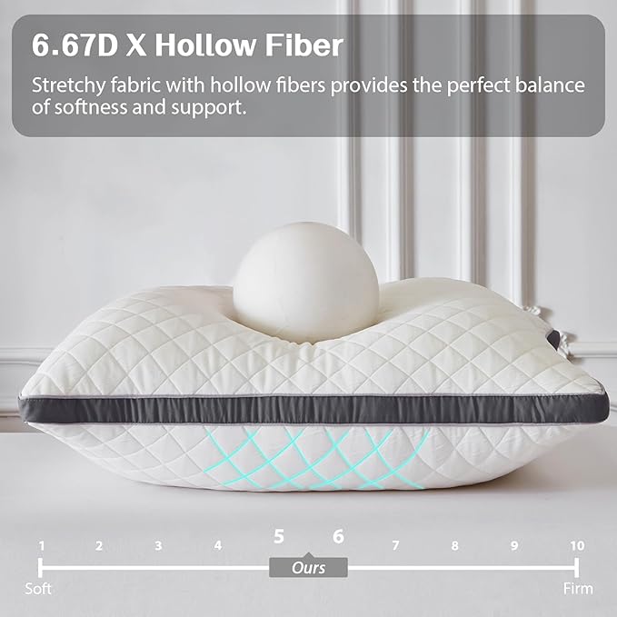 - Medium Soft Bed Pillow: We use high quality fibers,the diameter of each fiber can be accurate to 6.67D under the instrument, providing a supportive core for the king pillows. The elastic fabric provides enough space for the fiber components to stretch out, striving to achieve a balance of support and softness, giving you just the right amount of comfort.
