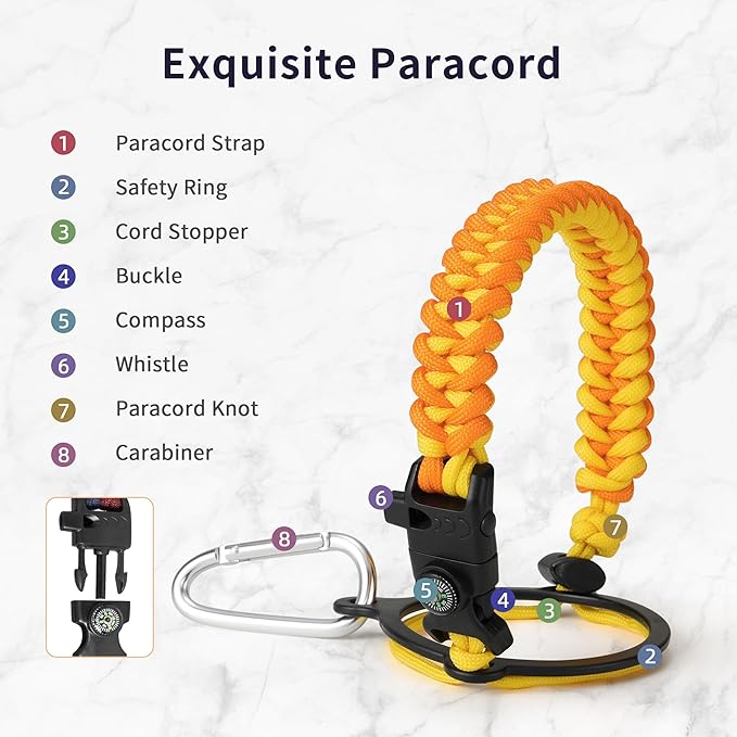 - Full-function Paracord: Brilliant paracord of matching colors bring out the bottle with a touch of youthful vibe. Compact compass and handy carabiner make the bottle the ideal survival kit for expeditions in the wild.