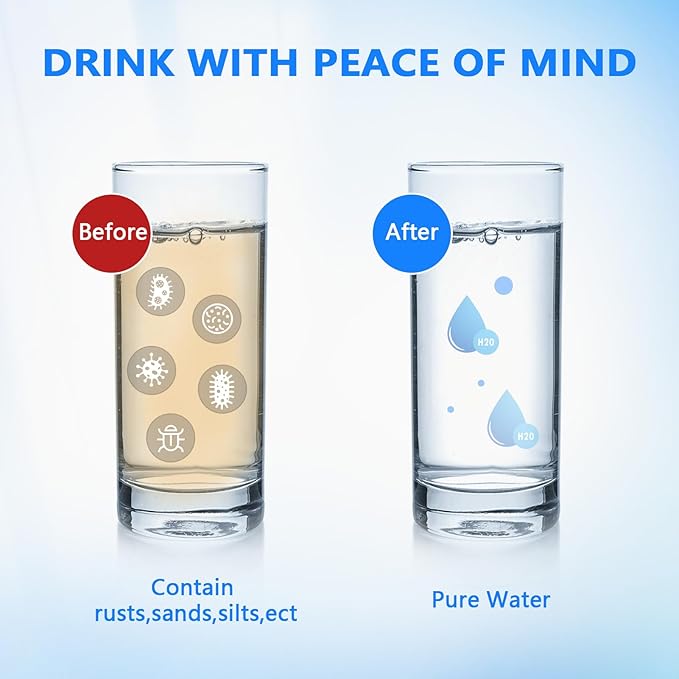 - 【HIGH-QUALITY MATERIALS】- Our sediment replacement water filter is carefully crafted with top-grade materials and adopts cutting-edge melt-blown technology. This not only ensures the highest safety standards for the water filter element. Therefore, there will be no fiber shedding. Let your family enjoy a safer and healthier life at all times.
