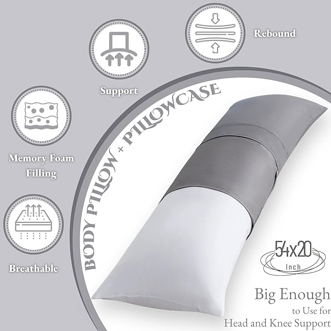 Ubauba Memory Foam Body Pillow with Cover, Full Large Body Pillows Insert for Adults with Envelope Closure Pillowcase, Firm & Fluffy Long Bed Pillows for Sleeping (20x54 inch, Dark Grey)