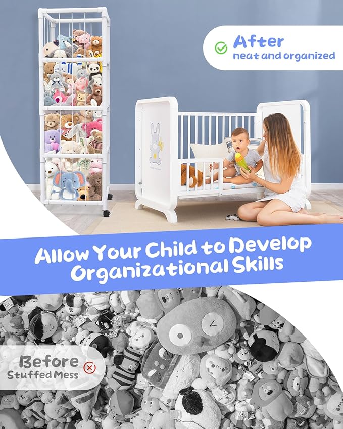 - EASY TO MOVE: Our plush toys corner organizer is equipped with 4 universal wheels, kids can easily move it to all corners of the house, such as the playroom, children's room, living room, etc., without any geographical limitations to play all over the house.