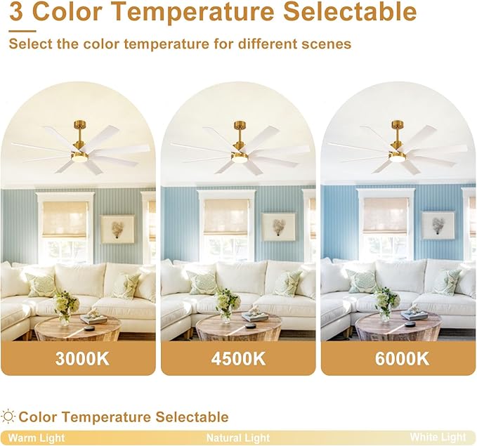 - Modern Industrial Design: This 72-inch large ceiling fan with lights, it with 8 pieces of fan blades, The charming pure White and metallic gold embellishments make the appearance of the ceiling fan very delicate, beautiful and advanced. Hang this ceiling fan with light, I believe it will instantly improve the aesthetic of your space. Fan blades made of ABS material have certain moisture-proof function, suitable for indoor or covered outdoor use ( living room, dining room, patio, bedroom, meeting room, hall, corridor etc )