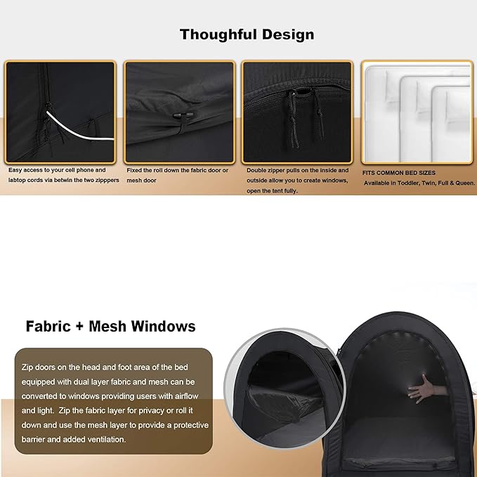 - ✔️Privacy & Breathability - Our privacy bed tent is made of fabric with excellent light blocking and breathability. In terms of product design, we achieve 360 ° all-round privacy, providing you and your family with a comfortable and safe sleeping environment. In addition, the bed tent also comes with two zipper doors and two side doors, as well as breathable mesh.