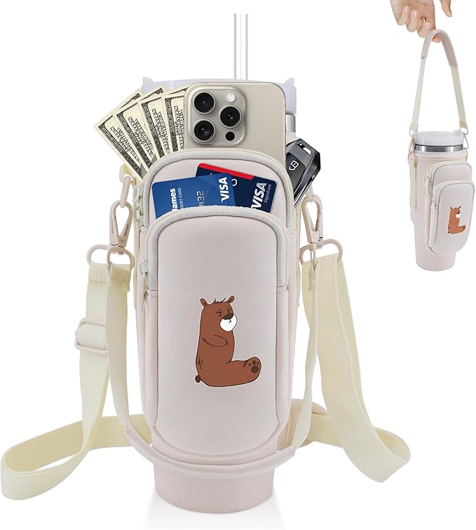 Water Bottle Carrier Bag with Phone Pocket for Stanley 40 oz Tumbler Neoprene Water Bottle Holder Pouch with Adjustable Strap Bollus with Straw Cover & Carabiner for Stanley Cup Accessories