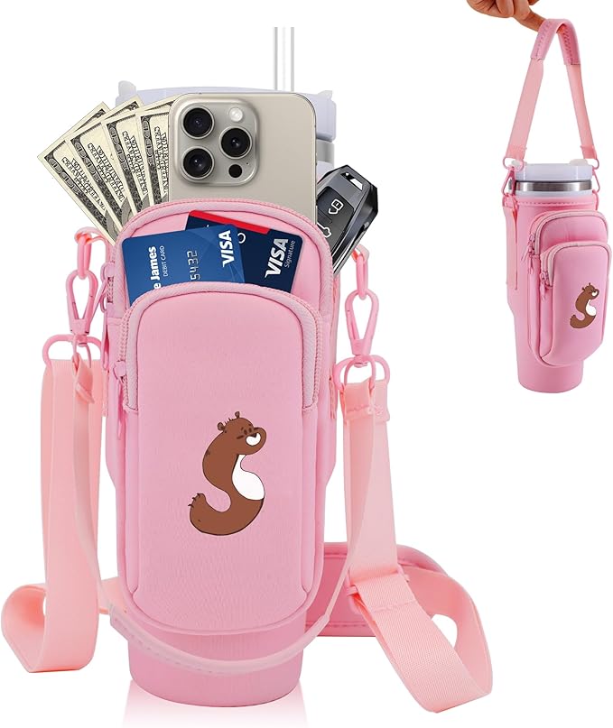 - đăSuper Capacity Multifunctional PocketsăThis water cup carrier bag for Stanley 40 oz tumbler is designed with an 8.1 Inch large side pocket with a transparent window, most cell phones can be put in the pocket, even with a protective case. Not only you can see the phone but also enables touchscreen functionality by window.