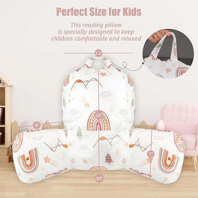 - SUPER SOFT AND COMFORTABLE: 16L×13W. The kids reading pillow has a velvety cover that is comfortable and skin-friendly. Leaning back on this cushion will make your kid feel as cosy as lying in the clouds!