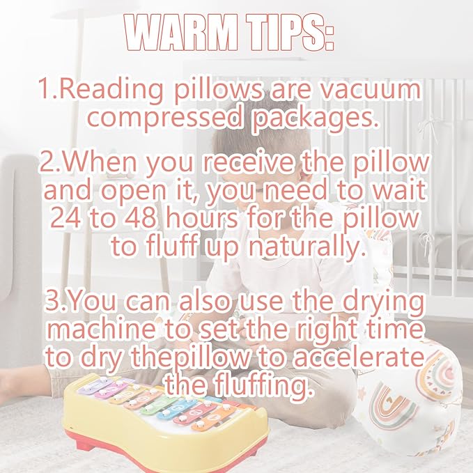 - VACUUM PACKAGING: We use vacuum packaging for reading pillow for kids. When you receive the pillow and open the package, please wait 24 to 48 hours for the pillow to fluff naturally, or use the dryer to speed up the fluffing.
