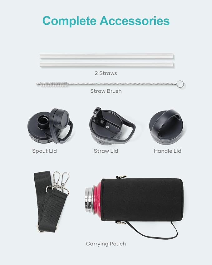 - Super Deal Combo: Buy 64oz insulated water bottle, get 7 accessories. The pack includes 1 x carrying pouch, 3 x lids, 2 x straws, and 1 x straw cleaner. This bottle is ideal for camping, hiking, cycling, running, gym sessions, or outdoor work, ensuring you stay hydrated wherever you go.