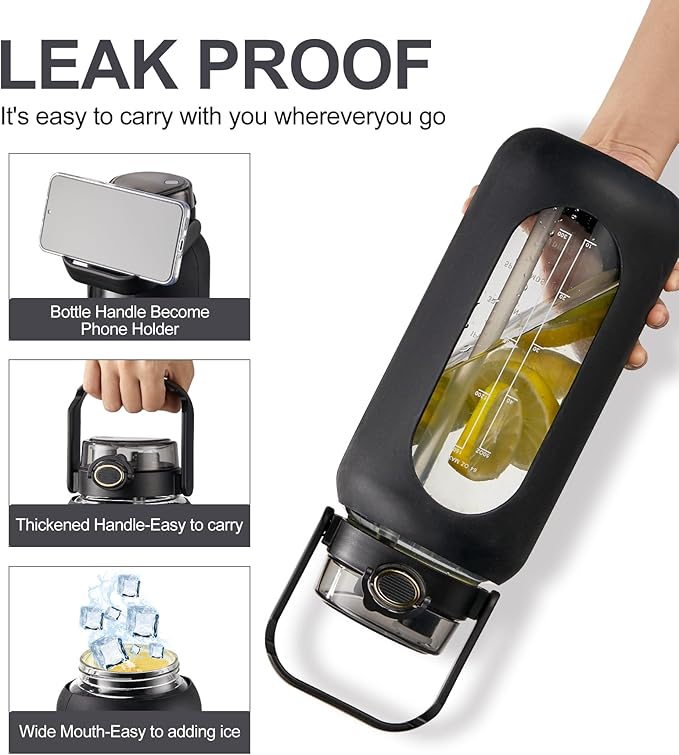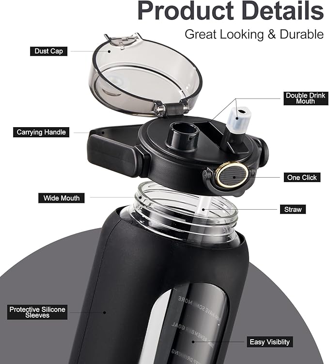 - POP UP LID & CARRY HANDLE: The glass water bottle lid is designed with secure lock and dust cover, it is dust-proof and leak-proof. The button design allows you to easily open the bottle cap with one hand and drink in time. One removable straw allows you to enjoy spill-proof sipping or fast water flow. It can also be used without straw, a dual-purpose water bottle. With a carry handle and anti skid grip design, it makes you easier to carry it to anywhere.