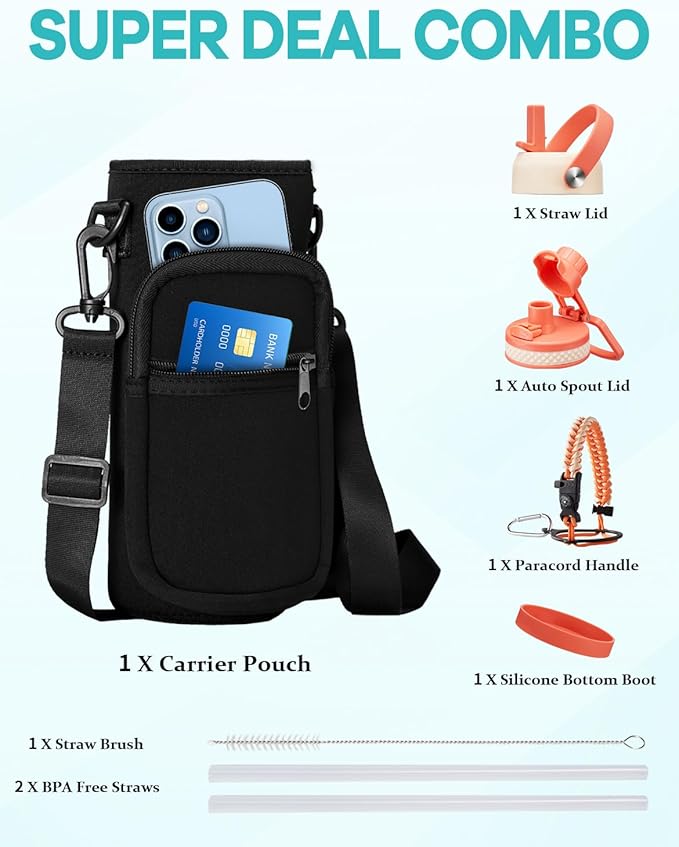 - SUPER DEAL COMBO - Buy one 32 oz insulated water bottles, get 9 accessories: 1 x straw lid, 1x Auto Chug lid, 1 x paracord handle, 2 x straws(BPA Free), 1 x carrier bag, 1 x shoulder strap, 1 x protective silicone boot, 1 x straw brush. The 32oz insulated water flask perfect to keep you stay hydrated throughout the day