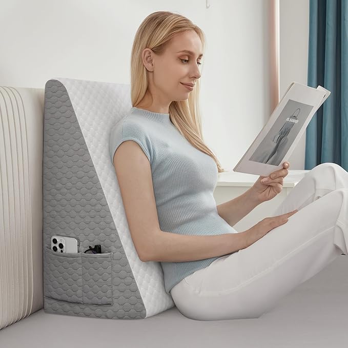 - Humanized design for unique bedding experience! The innovative design of this pillow wedge provides ultimate comfort and support, allowing you to sleep soundly through the night. Equipped with two side pockets and a portable handle, it is versatile enough for use in bed, on the couch, or even while reading or watching TV. The non-slip bottom ensures stability while you rest.