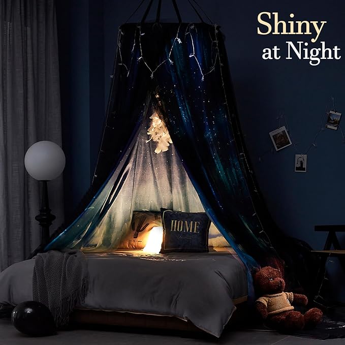 - 【Galaxy Pattern Printed Bed Canopy】 This exquisite bed canopy offers kids a fantasy castle to have fun inside. The galaxy pattern print is full of artistic and romantic colors, stimulate your child's imagination and creativity well. The canopy for kids room offers children a castle, a club and a secret garden, a personal space with their friends. Charming print canopy bed curtains make your bedroom full of energy. Unexceptionable gifts for kids, friends, family.