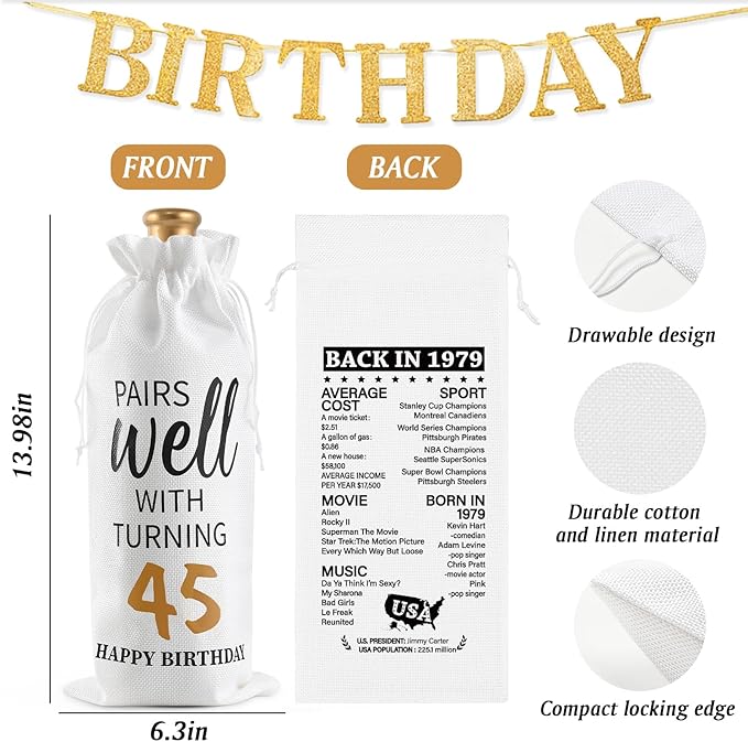 - [CREATIVE 45th BIRTHDAY WINE BAG] - Paired with the 45th birthday linen cotton wine bag printed with the words "BACK IN 1979" and "Pairs Well with turning 45 Happy Birthday" on the 45th birthday wine tumbler. Convenient for you to bring another bottle of wine to share with friends. It can serve as both a fashionable wine glass carrier and a precious souvenir, reminding everyone of how unique the world was in the year you were born.