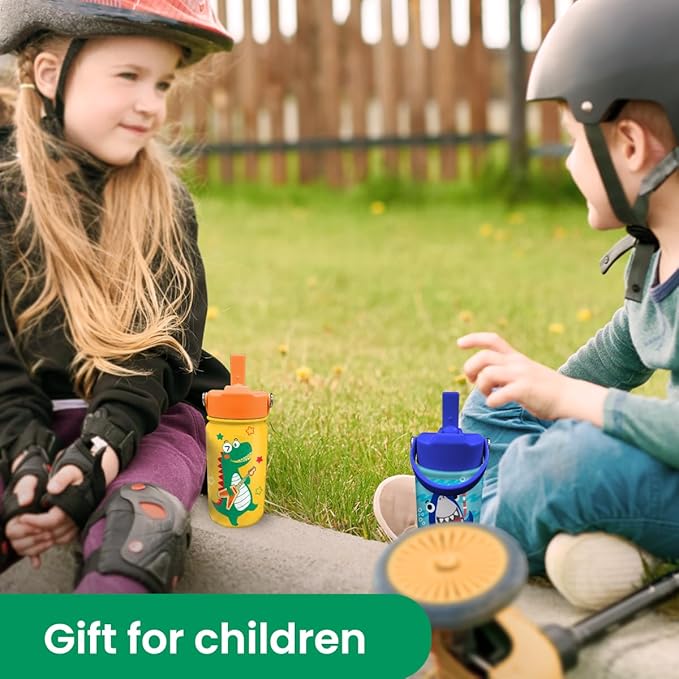 Dinosaurs Water Bottle - Dino Kids Water Bottle with Straw Lid - 12 Oz Insulated Stainless Steel Water Bottles for Toddlers Kid Boys - Travel Cup for School Sports