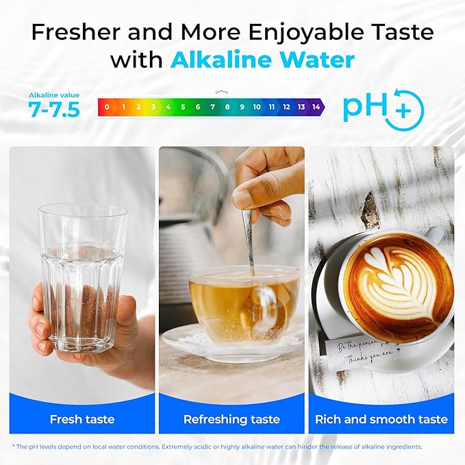 - ππ₯π€ππ₯π’π§π πππππ« ππ¨π« ππππππ« πππ¬ππ ππ§π ππππ₯ππ‘: Experience the refreshing taste of alkaline water. This under sink water filter can turn your water into alkaline water, which can make your tea and coffee taste better while improving your physical health. Enjoy the health benefits of mineral-rich water that supports bone strength, muscle function, and overall wellness.