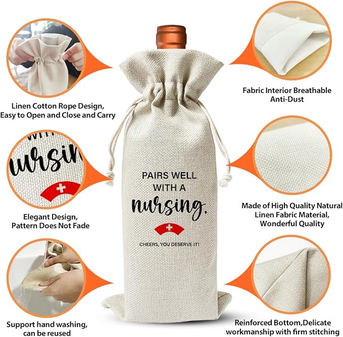 - PREMIUM MATERIAL: This Nurse Wine Bag Is Made Of Cotton Linen Material, With Clear Patterns, Uniform Stitching, Not Easy to Fade, Strong and Durable, Wine Bag With Drawstring Setting, Easy to Close And Open and Keep The Things in Bag Safe and Mystery.