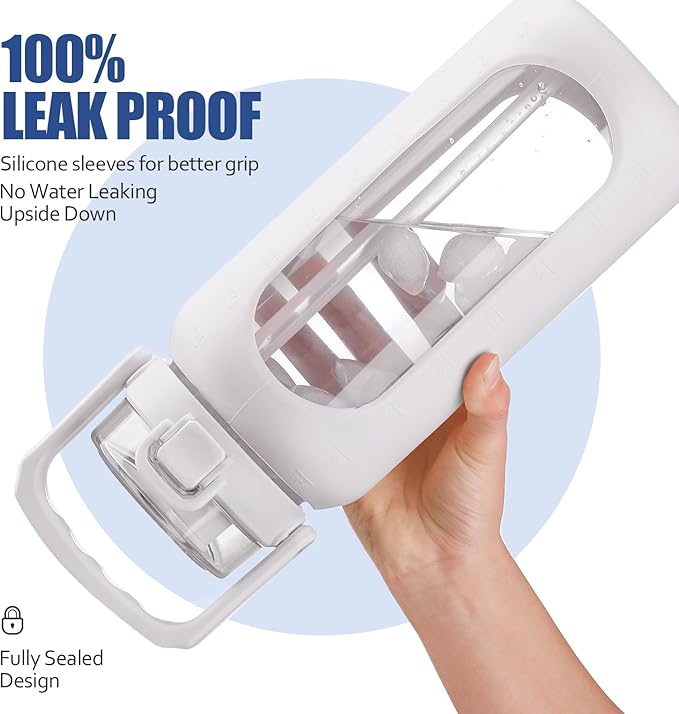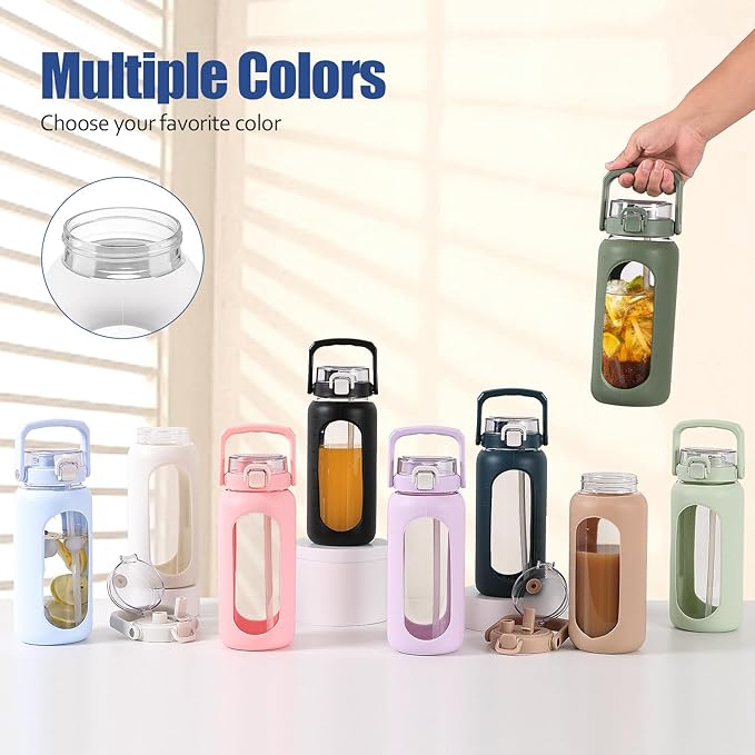 - LARGE CAPACITY WITH TIME MARKER: BLUEGO glass bottle has 64oz capacity with rubber sleeve TIME MARKER and water capacity markers. The clear and see-through window help you to track the amount of water you drink, always keeping you hydrated. Meanwhile the water bottle lid with a sealing cap that effectively prevents any leakage.