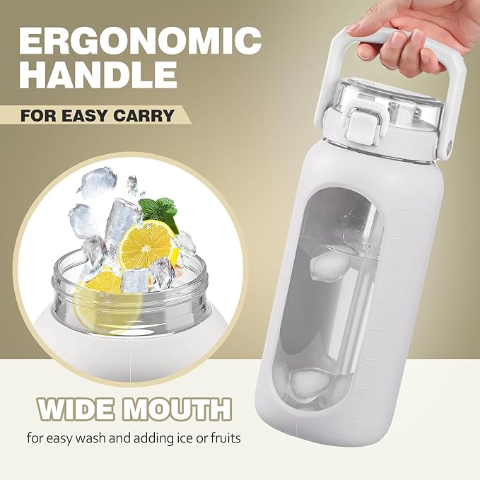 BLUEGO 64oz Glass Water Bottle with Handle and Straw, Motivational Sports Water Bottle with Time Marker and Silicone Sleeve Leakproof Drinking Bottle for Travel Gym Workout, White