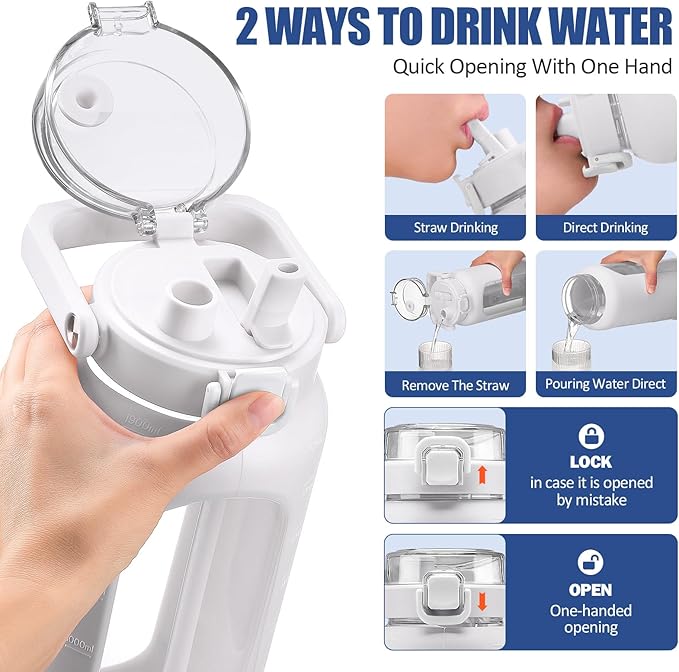- 2 WAYS TO DRINK: BLUEGO 64oz sports water bottle features POP-UP lid with ONE-CLICK SAFETY LOCK and a covered DUSTPROOF CAP to keep hygienic and better leakproof effect. The 2-IN-1 STRAW LID enables the water bottle two way to drink: spillproof sip by a built-in flip straw or direct drink through chug mouth, both are convenient and ergonomic.