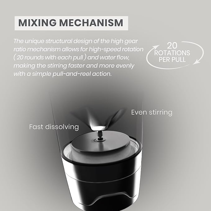 - ✔️Efficient High Gear Ratio Mechanism: Hurricup protein shake bottle enables high-speed rotation (20 rounds per pull) for quick and thorough blending of ingredients. The easy pull-and-reel action offers faster, more even stirring.