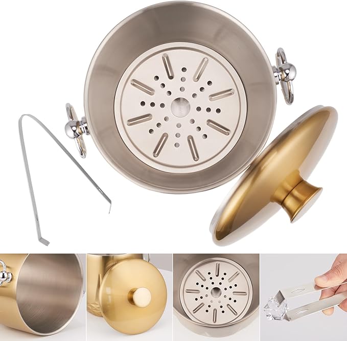 Ice Bucket with Lid, 3L Double Wall Stainless Steel Ice Bucket Keeps Frozen Longer, Insulated Ice Bucket with Tong and Strainer, Perfect for Parties, Cocktail bar, Wine, Champagne, Gold