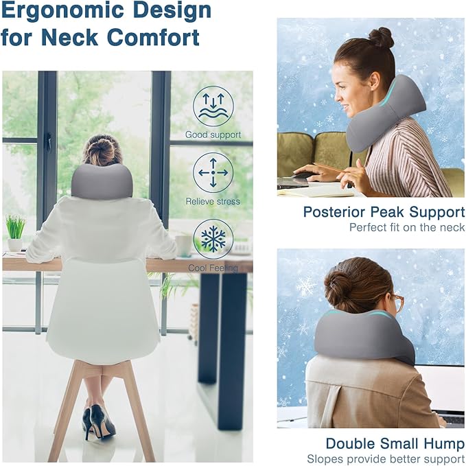 Travel Pillow for Airplane Memory Foam Neck Pillow, Soft & Support Travel Pillow for Travelling with Eye Mask, Earplugs and Storage Bag, Sleeping Rest, Car, Train and Home Use Cooling, Grey