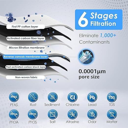 - ๐-๐ฌ๐ญ๐๐ ๐ ๐๐จ๐ฆ๐ฉ๐จ๐ฌ๐ข๐ญ๐ ๐๐ข๐ฅ๐ญ๐๐ซ&๐๐๐๐๐๐ญ๐ข๐ฏ๐ ๐๐ข๐ฅ๐ญ๐ซ๐๐ญ๐ข๐จ๐ง: Waterdrop D6 RO system adopts advanced filtration technology. With an accuracy of 0.0001 ฮผm, the 6-stage filter reduces most contaminants from water, including salt, atrazine, nitrates, PFAS, lead, sodium, chromium, etc. Two coconut carbon block layers reduce chlorine, taste, and odor to improve the water taste. Two PP cotton layers intercept sediment, rust, suspended solids, and other large particles.