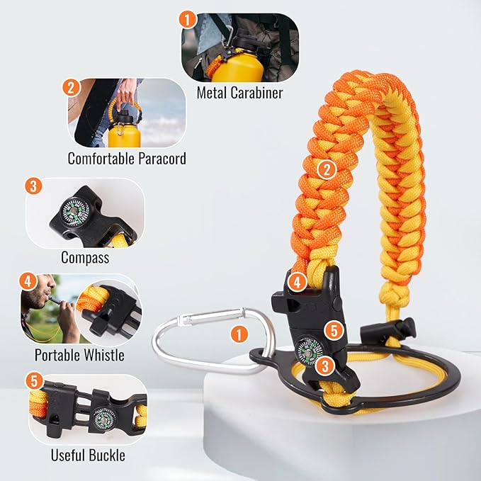 - Versatile Paracord Handle: Hand-woven with durable nylon paracord, the stylish handle of our water bottle not only matches its color but also includes a compass and carabiner. Paracord can make lifting a 64oz/128oz water jug easier for you, making it the perfect companion for all your outdoor adventures.