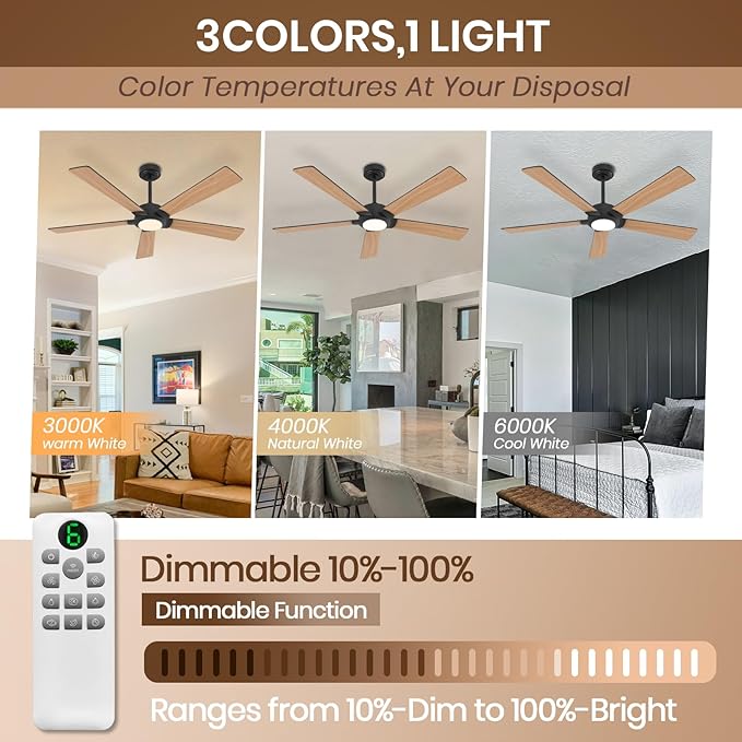 - 【3 COLOR TEMPERATURES AND DIMMABLE LIGHT】This modern ceiling fan is equipped with an energy-saving LED light source (with memory function) that can change the color temperature from cool light (6000k) to natural light (4500k) to warm light (3000k). In addition, this outdoor ceiling fan with light also has adjustable brightness, 10%-100% brightness adjustment is suitable for any scene.