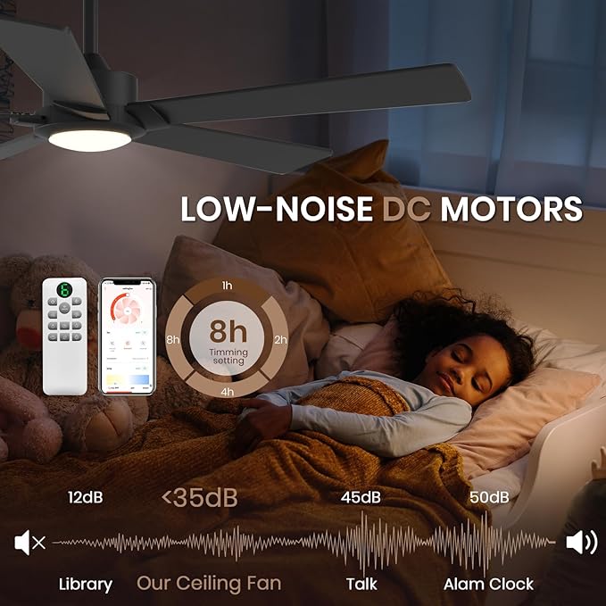 - 【QUIET REVERSIBLE DC MOTOR】Outdoor Ceiling Fans have adjustable airflow direction so you can switch from down-blowing mode in the summer to up-blowing mode in the winter, keeping you warm in the winter and cool in the summer, and keeping the air moving all year round. Additionally, each black ceiling fan is factory sound tested to be no louder than 35 decibels.