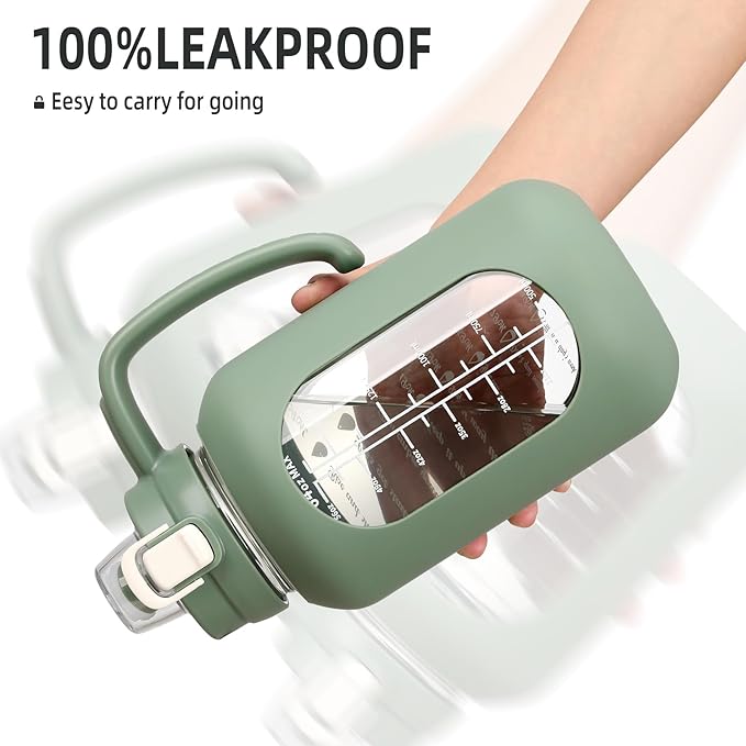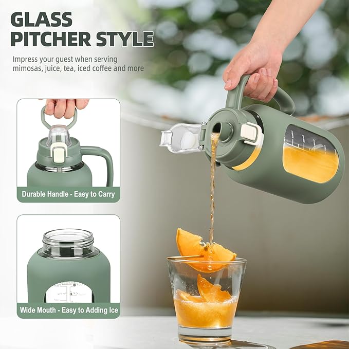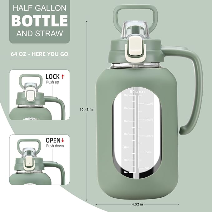 - 【Glass Water Bottle with Silicone Sleeve】Olivego big water bottle for easy to carry and use. The half gallon water bottle with straw has an anti-slip and high quality silicone sleeve to protect the glass water bottle and help prevent it from being slippery in your hands or slight bumps.The handle ensures a firm grip & our wide mouth flip cap spout makes pouring easy & smooth.