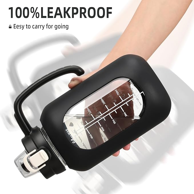 - 【Glass Water Bottle with Silicone Sleeve】Olivego big water bottle for easy to carry and use. The half gallon water bottle with straw has an anti-slip and high quality silicone sleeve to protect the glass water bottle and help prevent it from being slippery in your hands or slight bumps.The handle ensures a firm grip & our wide mouth flip cap spout makes pouring easy & smooth.