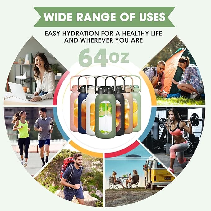 Glass Water Bottles 64 oz - Large Half Gallon Motivational Glass Water Bottle with Time Marker Straw Phone Holder Handle, 64oz Daily Water Intake Jug with Silicone Sleeve for Office Work Gym Olive