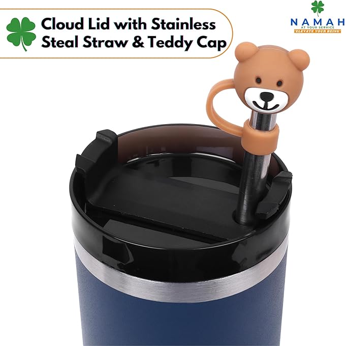 Tumbler with Handle & Extra Cloud LID – 30oz/900ml, Premium 304 Stainless Steel, Insulated Water Bottle, Leak-Proof, Steel Straw, Teddy Straw Cap, Cleaning Brush & Carabiner Hook (Midnight Teal Blue)