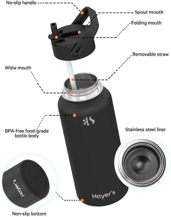 - 32OZ CAPACITY : Hayer's 32oz black water bottle with straw and spout design, great for kids and toddlers to stay hydrated during playtime. stainless steel metal water bottle good for adult outdoor activities and work.