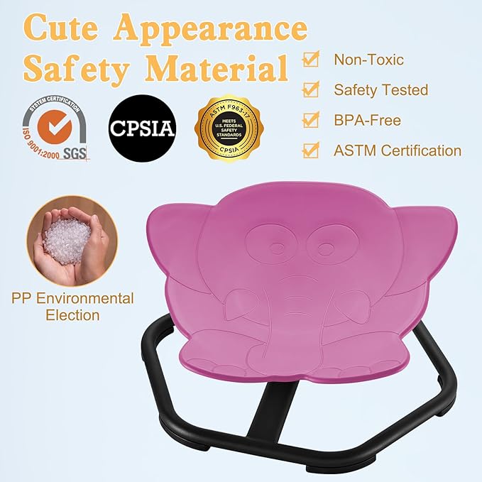 - 【Safe Design】: The elephant swivel chair is made of high-quality plastic and metal, which is safe, non-toxic, sturdy, and can be used for a long time. The bottom has an anti slip pad design, which ensures that children will not fall no matter where they play.