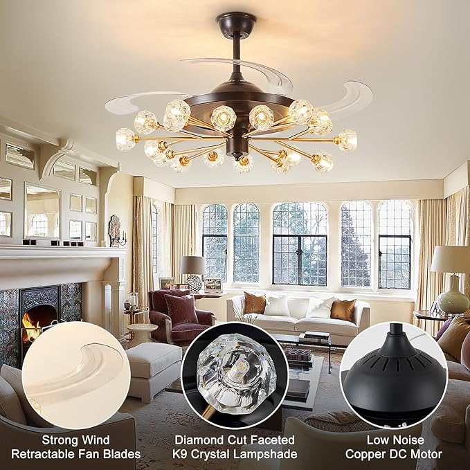 - Gold Chandelier Fan Ceiling: Perfect combination with sputnik crystal fandelier with retractable ceiling fans; Diameter 31.5", Height 18.5"-21.7", Width of Base 5.7", 18 x G9 Bulb Base(Bulb Included); 4 invisible ABS ceiling fan blades. Ceiling fan blades will expend and retract automatically; Diameter 48" when extended and 27.6" when closed; retractable ceiling fan with lights make house looks more beautiful