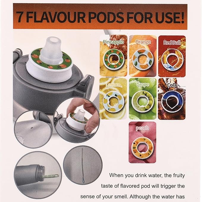 - Flavor-Packed Hydration: As you drink our air water bottle the Flavor pod which is attached to the mouth of the bottle, produces a fruity perfume that fills your nose and improves your whole sensory experience. Your brain's taste-related cells are activated by this fragrance, giving the impression that you're drinking a flavored beverage even though you're only sipping plain water.