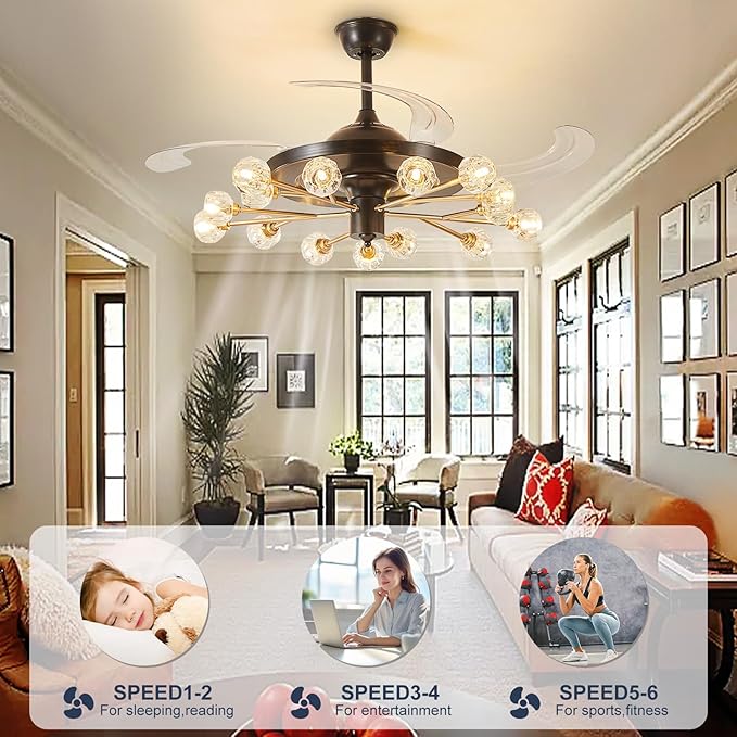 - Crystal Sputnik Ceiling Fan with Light: Perfect combination with sputnik crystal fandelier with retractable ceiling fans. Diameter 31.5", Height 18.5"-21.7", Width of Base 5.7", 15 x G9 Bulb Base(Bulb Included). 4 invisible ABS ceiling fan blades. Ceiling fan blades will expend and retract automatically. Diameter 48" when extended and 27.6" when closed. Retractable ceiling fan with lights make house looks more beautiful