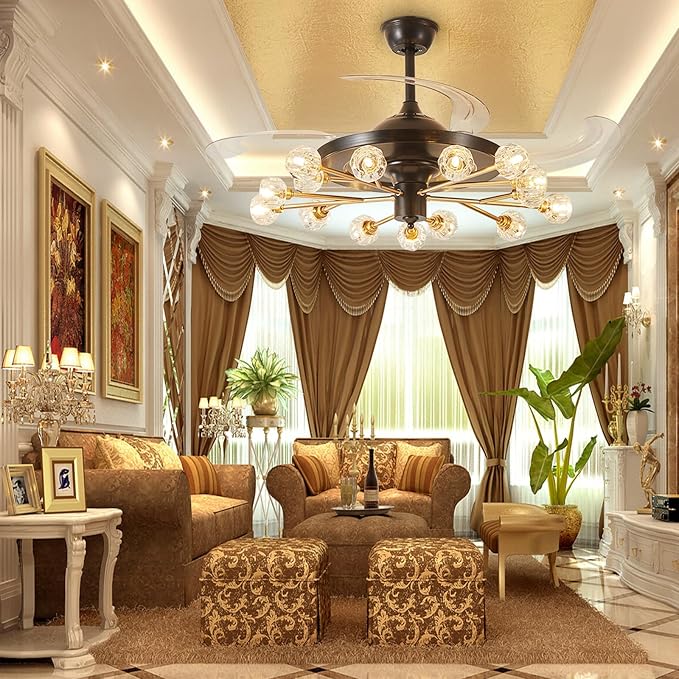 - Black and Gold Chandelier Fan: The sputnik fandelier ceiling fan with crystal lampshade gives you a feeling of luxury and stylish, which is an art not just a light fixture. The black and gold fandelier ceiling fan combine modern aesthetics with medieval style, making it suitable for restaurants, living rooms, bars, offices, corridors, kitchens, cafes, farmhouses and other places. Decorate your home space with our gold fandeliers for dining room