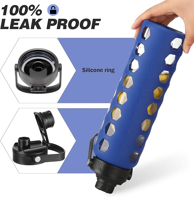 MUKOKO Glass Water Bottles, 32oz Glass Tumbler with Straw, Drinking Bottles with 2 Lids-Handle Spout Lid&Bamboo Straw Lid, Motivational Water Bottle with Time Marker and Silicone Sleeve, 1 Pack-Blue