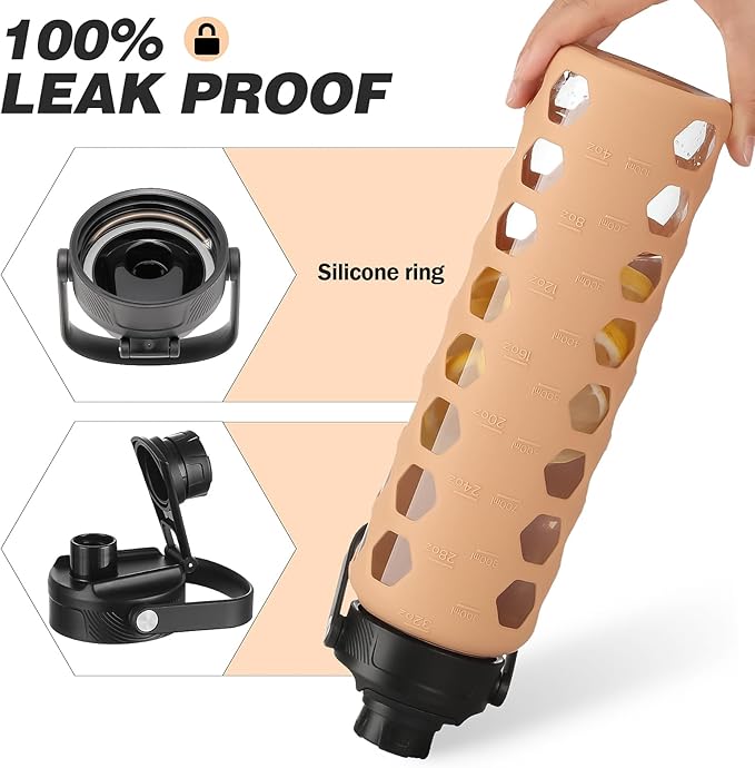 - GLASS WATER BOTTLES WITH TIME MARKER:MUKOKO 32oz glass water bottle with time marker preserves the purity of water.This is a very handy way to keep up with daily water intake,stay hydrated and healthy.