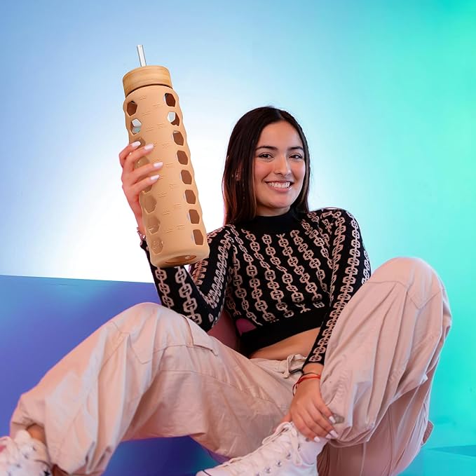 - THE PERFECT DESIGN:Reusable water tumblers are made of more harder and sturdy borosilicate glass and wrapped in a silicone sleeve for a good grip.Especially like that the bamboo lid has a silicone bottom that doesn't contact the liquid inside.
