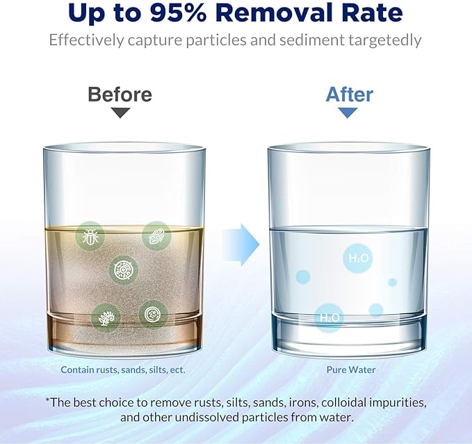 - [EFFICIENT FILTRATION] - This whole house water filter has a larger specific surface area than the original sediment filters because of pleated design. Remove sand, dirt, silt, rust and scale particles more effectively. It provides you with stable and continuous water flow without obvious pressure drop. Ensure the experience of household water use.