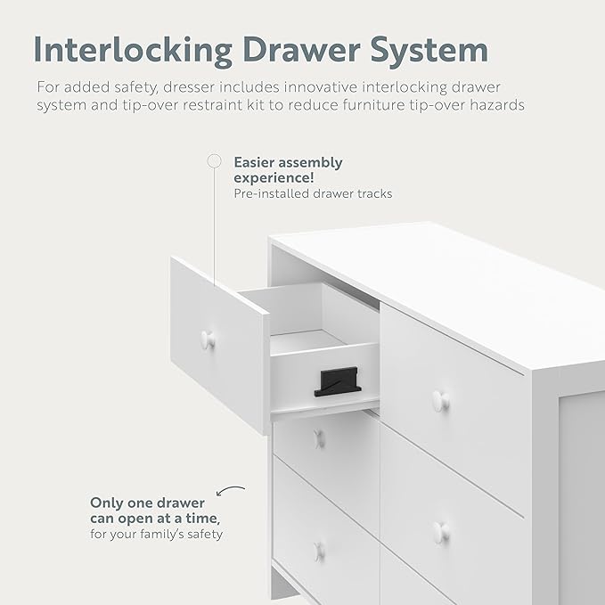 Storkcraft Calabasas 6 Drawer Dresser (White) - GREENGUARD Gold Certified, 6 Drawer Dresser with Interlocking Drawer System, Dresser Drawer Organizer for Kids' Bedroom