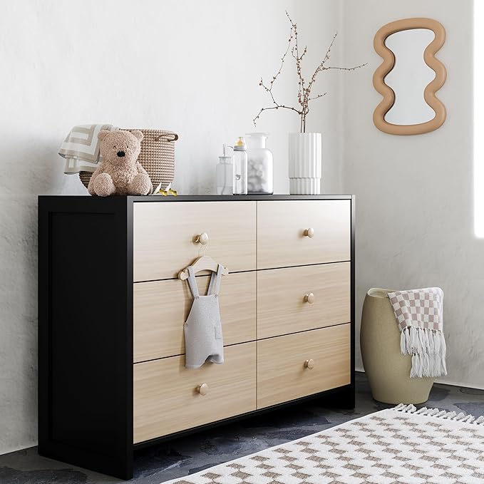 Storkcraft Calabasas 6 Drawer Dresser (Black with Driftwood) - GREENGUARD Gold Certified, 6 Drawer Dresser with Interlocking Drawer System, Dresser Drawer Organizer for Kids' Bedroom