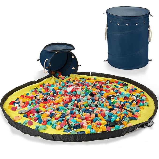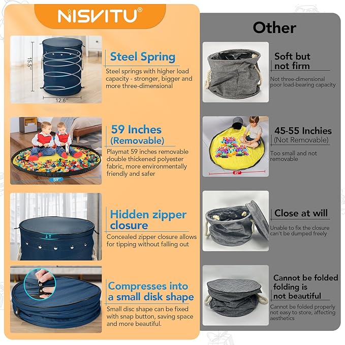 - Plenty of Space:Our kids toy organizer measures 15.5 inches tall and 12.6 inches in diameter, comes with a roomy 59-inch diameter play mat, has fenced edges to prevent toys from scattering, and can hold up to 11 gallons of toys. When the foldable storage box is not in use, the entire storage basket can be compressed into a small round cake that can be fixed with snap buttons. It is small and easy to store,hidden zipper is more beautiful.